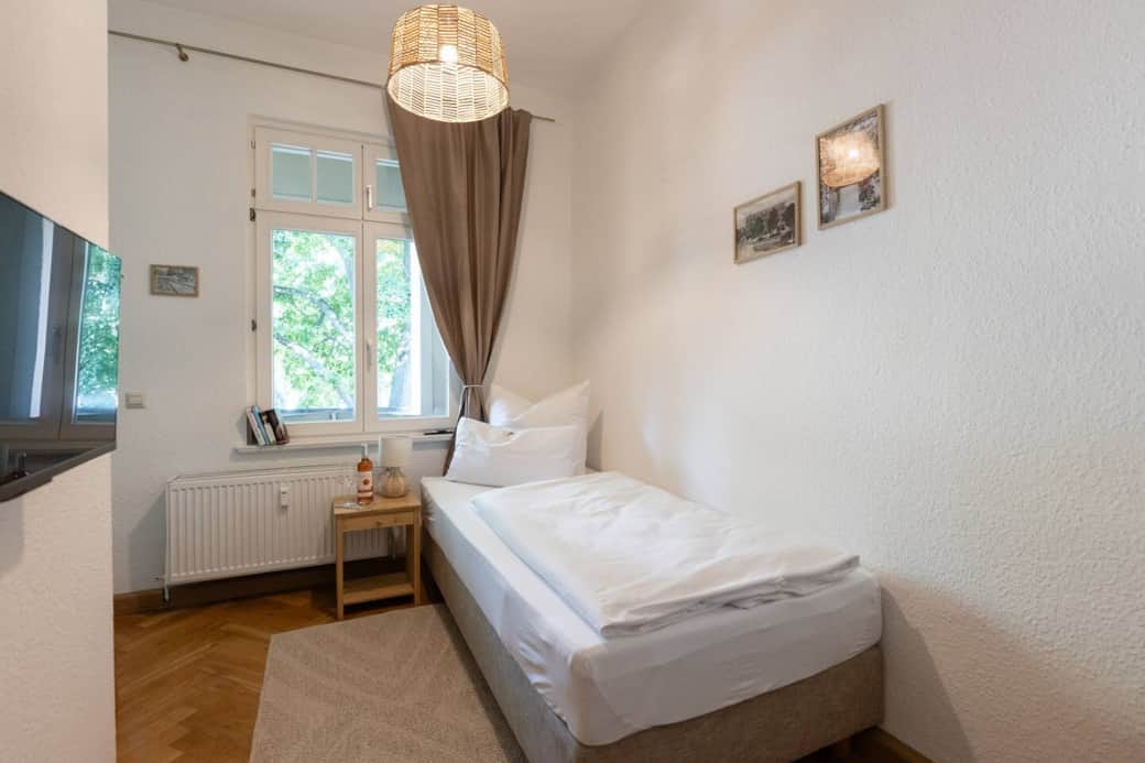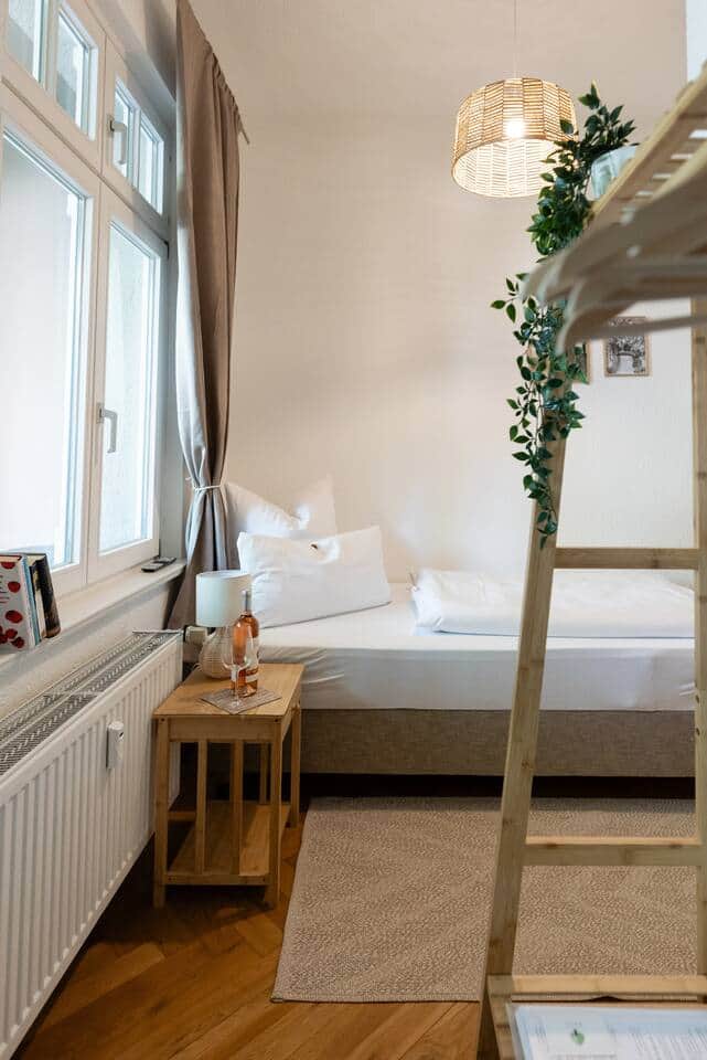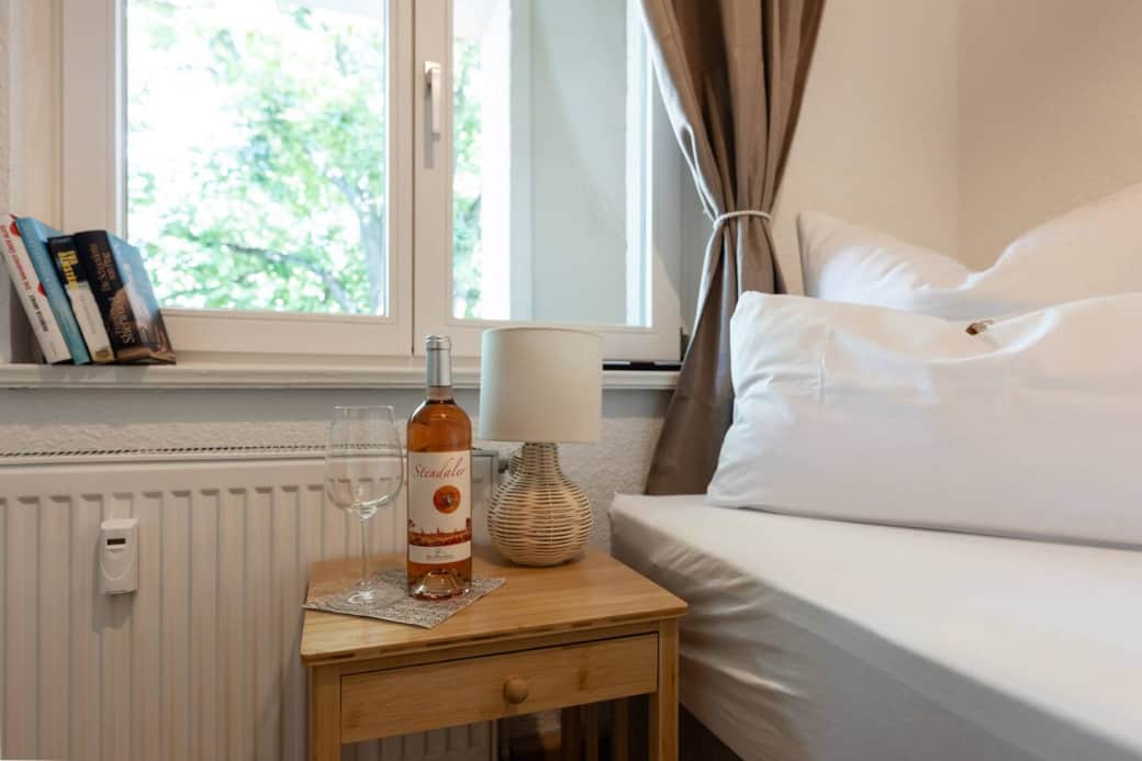 Das kuschelige Einzelzimmer besticht vor allem durch den schönen Balkon mit Lounge-Ecke und Blick ins Grüne. Ein hochwertiges Bett mit Federkernmatratze, ein Smart-TV und ein neues Bad runden den Komfort ab. Klein aber total gemütlich! Die Gäste-Etage bietet außerdem eine neue, gut ausgestattete Küche mit allen E-Geräten zur gemeinschaftlichen Nutzung und einen schönen Aufenthaltsraum mit bequemen Sesseln und viel Platz zum Arbeiten. Perfekt für Alleinreisende, digital Nomads oder Berufspendler. Das 'Wincki' öffnet seine geschichtsträchtigen Türen direkt am Winckelmannplatz und begrüßt Gäste in 7 verschiedenen und modernen Zimmern - alle frisch renoviert und liebevoll ausgestattet mit eigenem Bad, teilweise hohen Stuckdecken, tollem Parkettboden, Balkon und Flügeltüren. Jedes Zimmer ist liebevoll ausgestattet und bietet neben einem Smart-TV, einem sehr kuschliges Bett, tolle Ausblicke in die Stadt auch eine Menge Platz zum Wohlfühlen. Zudem gibt es eine voll ausgestattete Küche, eine Waschmaschine und einen schönen Essbereich zur gemeinschaftlichen Nutzung. Kostenfreie Parkplätze stehen direkt am Haus allen Gästen zur Verfügung. Schlüsseltresor 24\7 Checkin Schreib uns doch gern eine Nachricht. Das Gästehaus ist wunderbar gelegen direkt am Winckelmannplatz und der Marienkirche und am Start der Einkaufsmeile 'Breiten Straße' mit vielen kleinen Läden und tollen Restaurants wie dem 'Daily am Dom' und dem 'Akis'. Parkplätze stehen direkt am Haus auf einem abgeschlossenen Parkplatz zur Verfügung. Von dort aus kannst du alles ganz bequem zu Fuß erkunden. Alle Sehenswürdigkeiten wie der Roland, das Winckelmann-Museum und sogar der Stadtsee können bei einem schönen Spaziergang durch Stendal erkundet werden. Aufgrund er Größe des Zimmers sind keine Zustellbetten/Babybettchen möglich.